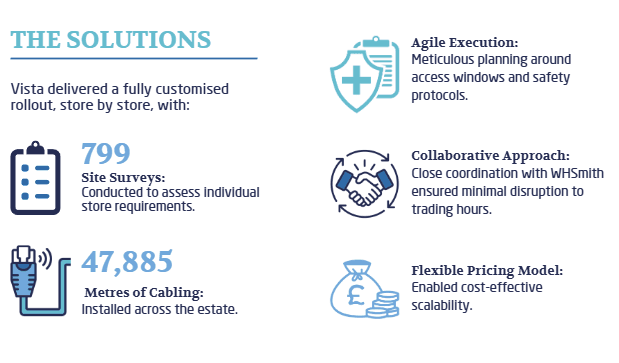 Each store had unique connectivity requirements based on its layout, location, and operational needs. Vista conducted 799 individual site surveys to assess conditions and design bespoke solutions. This tailored approach was essential to ensure every store received a fit-for purpose network upgrade.